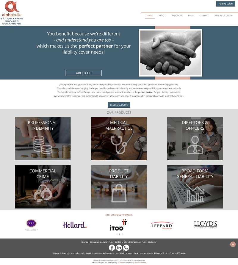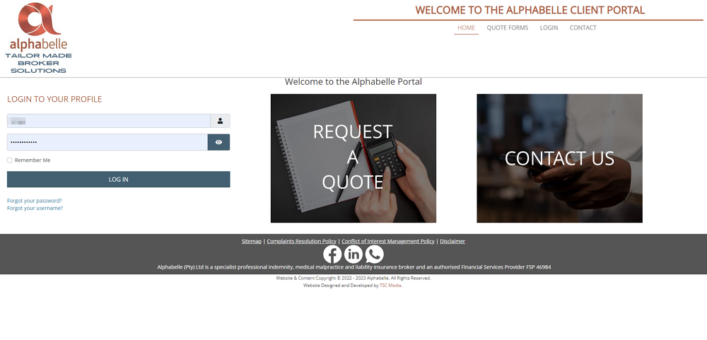 In additional to their website, and after previous failed attempts with other developers, we went on to develop the Alphabelle Portal for Alphabelle clients which comprises of intricate multipage quotations and an access controlled client section for documents, claims etc.