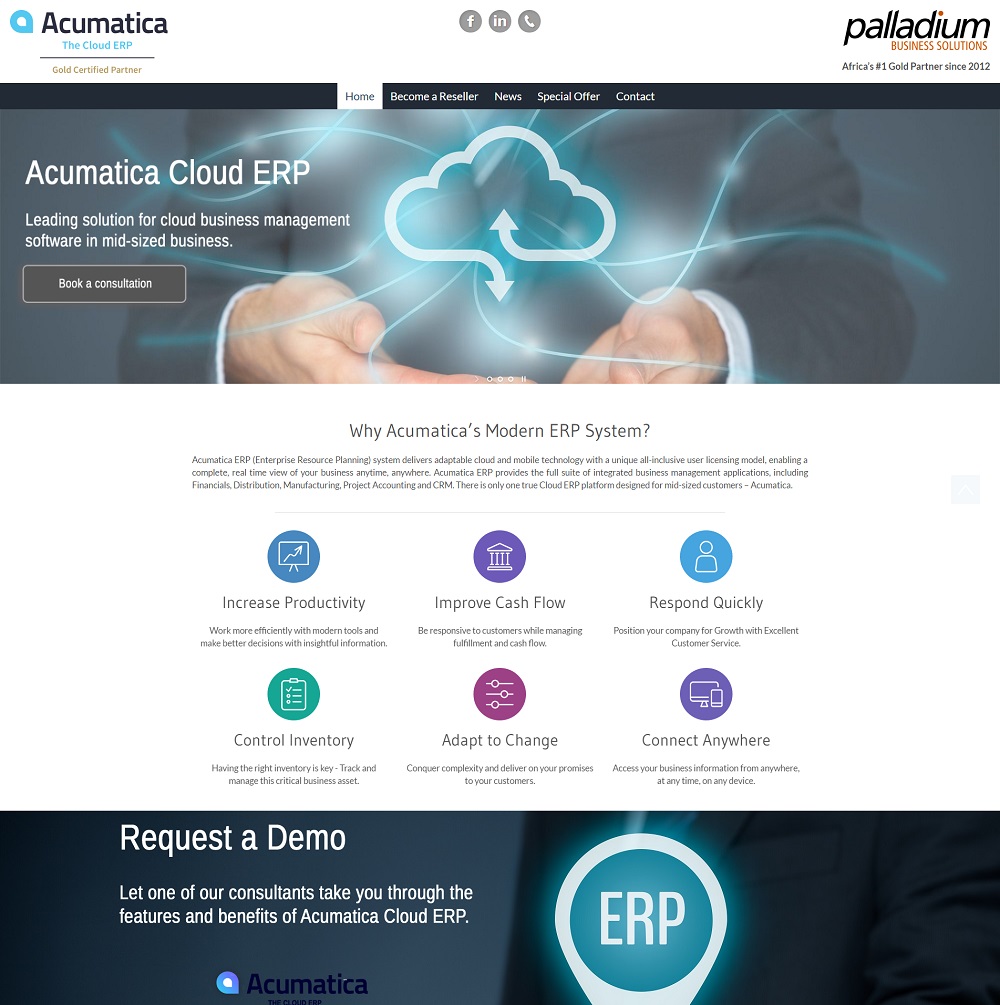 Palladium needed a new website for their Cloud ERP Solution, Acumatica. They have been a gold partner with Acumatica since 2012. We provided the initial wireframe and they supplied us with their design on how they wanted the site to look. We added layer sliders and a parallax section to the home page.
