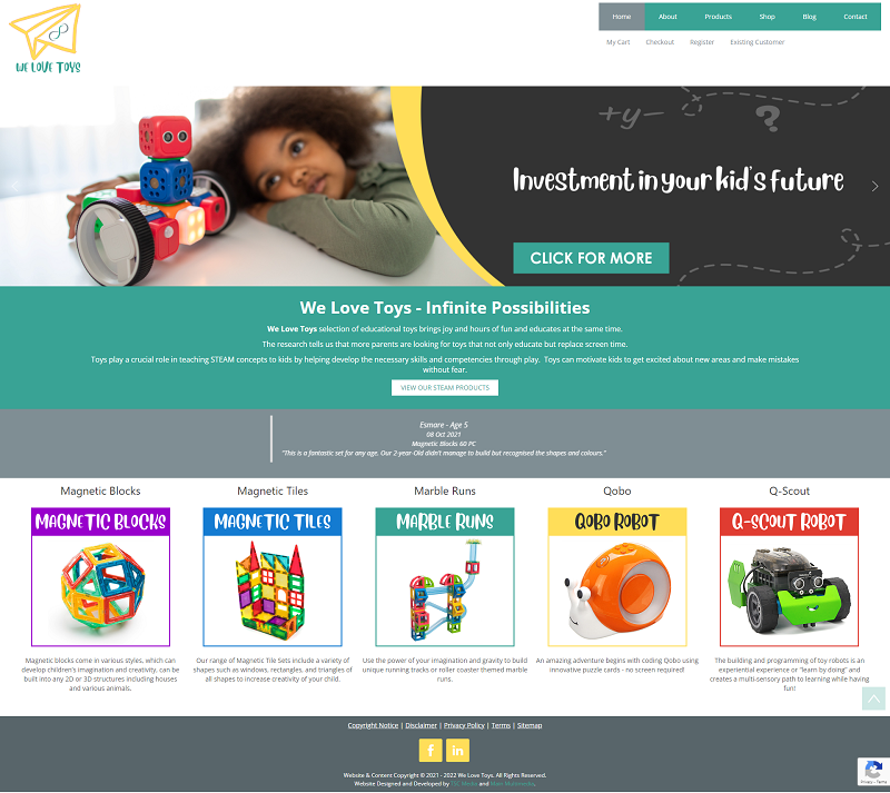 We Love Toys, marketed by Main Multimedia, started in 2021 and required a website with fully functional online shop. We designed the website and developed the online shop with PayFast plugin. The site was protected with a SSL certificate and Recaptcha. The banners and artwork we designed were also used for marketing on social media. While active, We Love Toys was on SLA maintenance and was hosted with TSC Media.